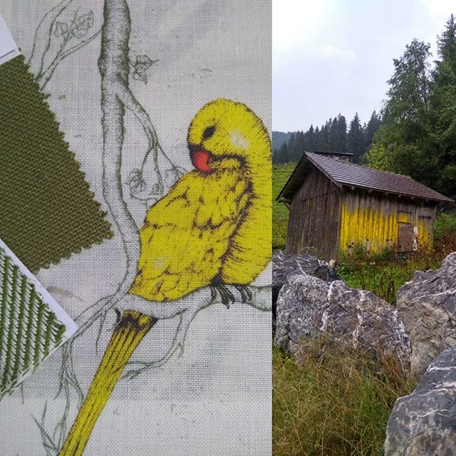 KOTHEA samples of our handwoven vespa linen in ecru and meadow, wade linen in basil and this delicately drawn parakeet printed fabric from Tradescant. Fabric samples inspired by this yellow painted hut we came across on a walk in the French Alps. . . . . . . .