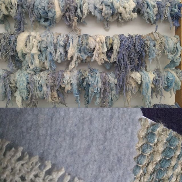 Kothea samples of bobbly wool in sky and indigo, handwoven linen sheer snow bud in ecru and linen wool in cloudy sky inspired by Jannis Kounellis dyed wool sculpture found in the Tate modern.