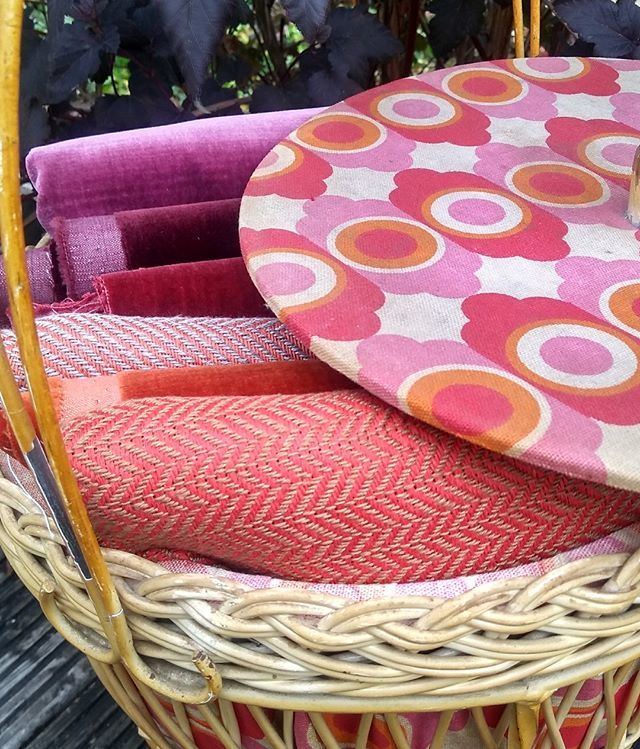 kotheastudio Kothea fabric samples in sunset colours inspired by this mid century wicker and fabric sewing basket
