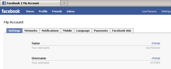 2. From the facebook menu go to SETTINGS and then to “ACCOUNT SETTINGS”. You will see something like the following where we now want to change the Username NOT the name.